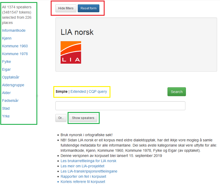 NB! Sidan LIA norsk er eit korpus med eldre dialektopptak, har det ikkje vore mogleg å samle fullstendige metadata for alle informantane. Dei seks øvste kategoriane skal vere utfylte for alle: Informantkode, Kjønn, Kommune 1960, Kommune 1978, Fylke og Eigar. Dei andre kategoriane er utfylte der det er funne informasjon. Dette betyr til dømes at om du vel 72 år i alderskategorien, vil du få søkjeresultat frå alle som er registrerte i metadata-basen som 72 år, ikkje frå alle dei eventuelle 72-åringane i korpuset vi ikkje kjenner alderen til.