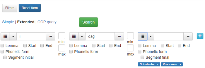 Utvida søk (sjå figur 7) gir fleire søkjemoglegheiter. Du kan søkje både på enkeltord og fraser, på lemma, starten eller slutten på ord, på lydnær stavemåte eller på starten eller slutten på segment. Vel du Phonetic form, vil du berre få resultat frå den lydnære transkripsjonen. Du kan òg søkje på ordklasser, morfologiske trekk eller andre taggar.