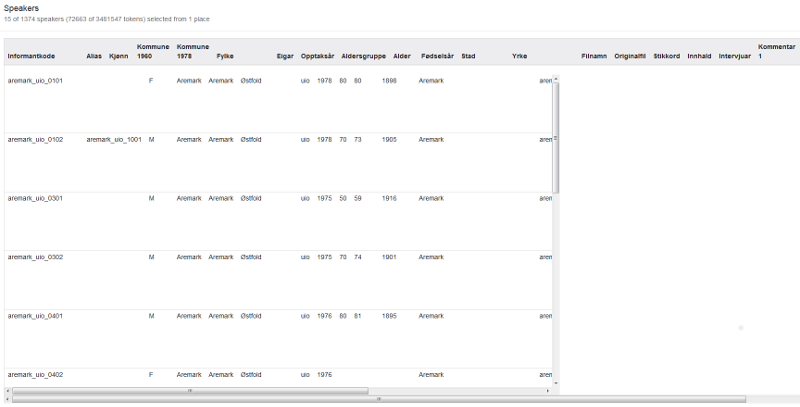 Dersom du ønskjer å sjå ei samla oversikt over informantane du har valt, klikkar du på Show speakers-knappen nedanfor ordsøkjeboksen ved siden av Or-knappen, sjå figur 15. Resultatet blir som i figur 18 for utvalet frå figur 17. (NB! Vi jobbar med ein penare presentasjon som er lettare å lese. Bildet nedafor er kraftig forminska for å vise at ein kan sjå mange kateforiar metadata til høgre ved å bruke linja nedst i vindauget.