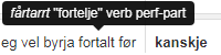 Dersom du held musepeikaren over ordet, får du opp eit lite vindauge med informasjon om lemma, ordklasse, annan morfologisk informasjon og taggar, sjå figur 3. Les meir om ordklasser og taggar i 1.2.2.3 og 1.2.2.4.