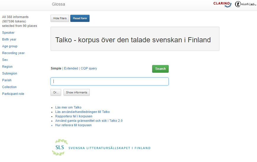 Talko 3.0 använder den nyaste versionen av sökgränssnittet Glossa, som utvecklats vid Tekstlaboratoriet vid Universitet i Oslo. Den här manualen innehåller en kort beskrivning av hur du kan göra sökningar i Glossa.