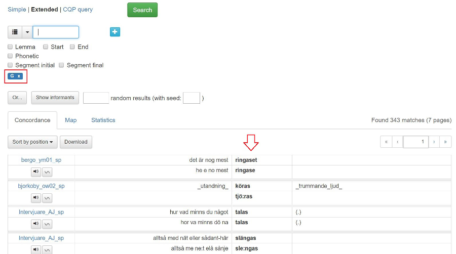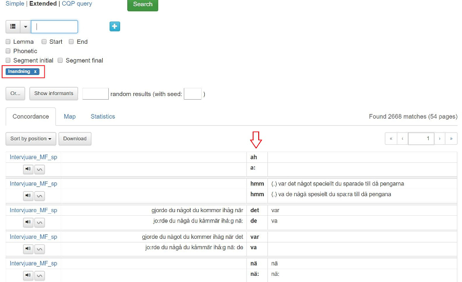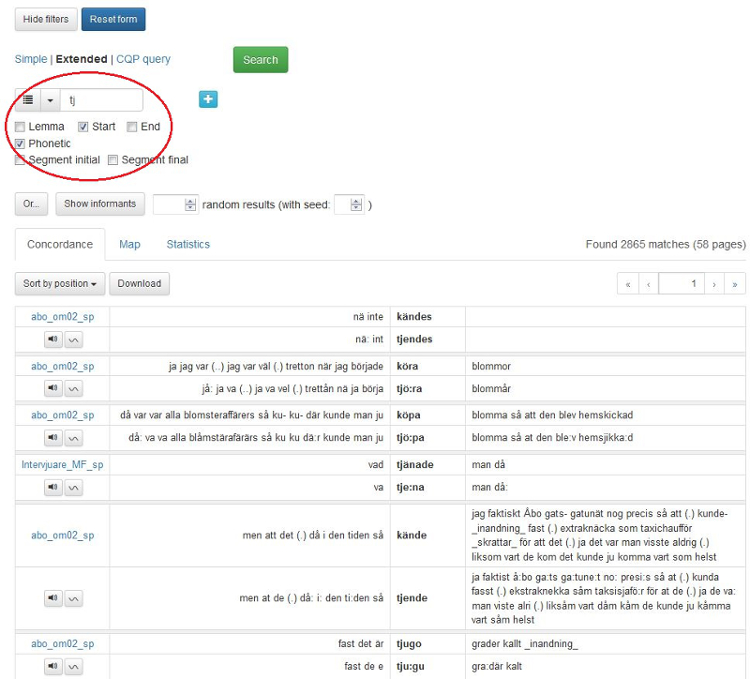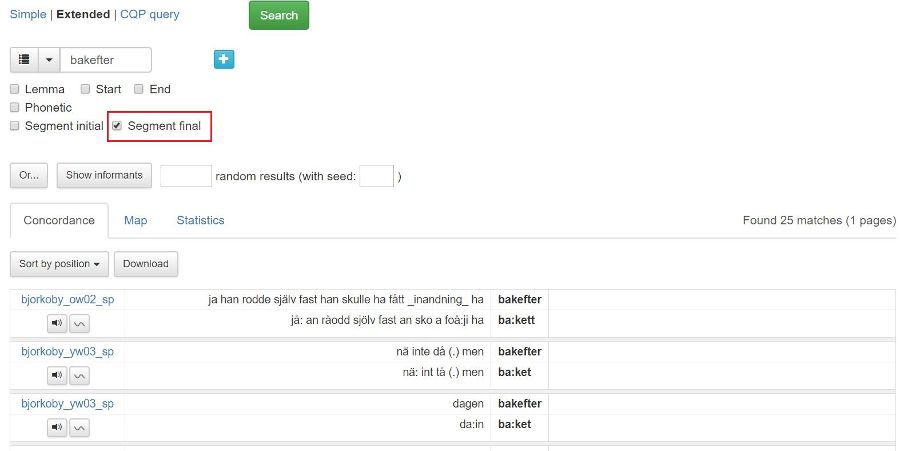 2.2.2 Sök på Lemma, Start, End, Segment initial, Segment final eller Phonetic