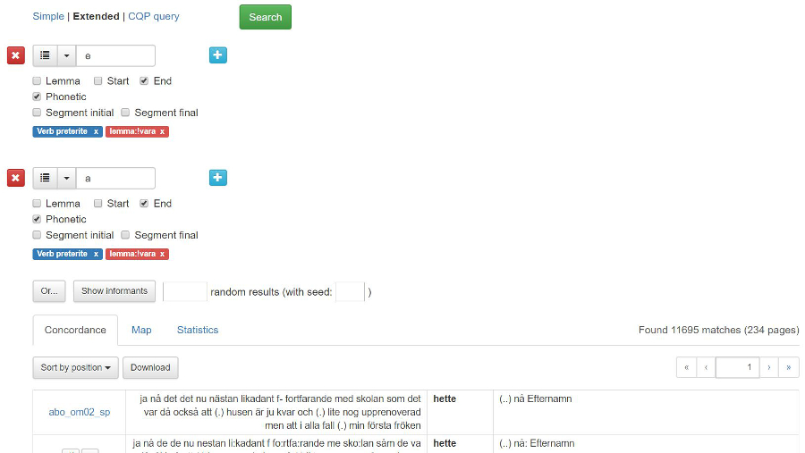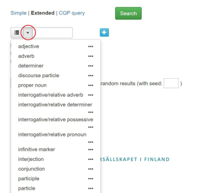 Utökad sökning (Extended) ger fler sökmöjligheter. Du kan t.ex. söka på enskilda ord, fraser, eller lemma men du kan även söka på ordklasser, morfologiska drag eller andra typer av taggar.