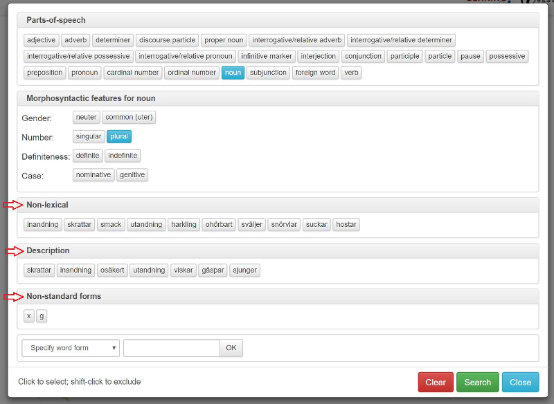 Om du väljer en ordklass under Parts-of-speech får du också tillgång till alternativen under Morphosyntactic features för den ordklass som du har valt. I bild 13 syns en sökning på Noun plural. Om du väljer flera ordklasser, t.ex. noun och verb, kommer du att få träff på ord som är taggade antingen som substantiv eller som verb De alternativ du väljer kommer upp som blåa rutor under sökrutan på startsidan efter att man klickat på Search. Det är möjligt att utesluta ett alternativ ur en sökning genom att hålla in Shift och välja knappen. Ditt val syns då som en röd ruta under sökrutan på startsidan.