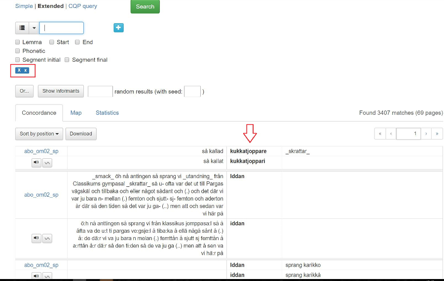 Under sökrutan finns det sex rutor som man kan kryssa för: Lemma, Start, End, Segment initial, Segment final eller Phonetic.