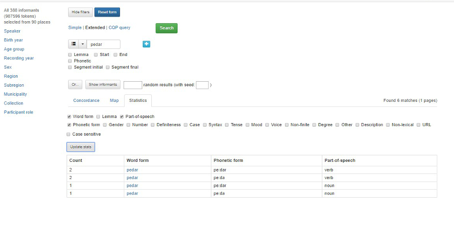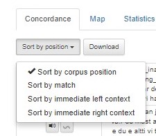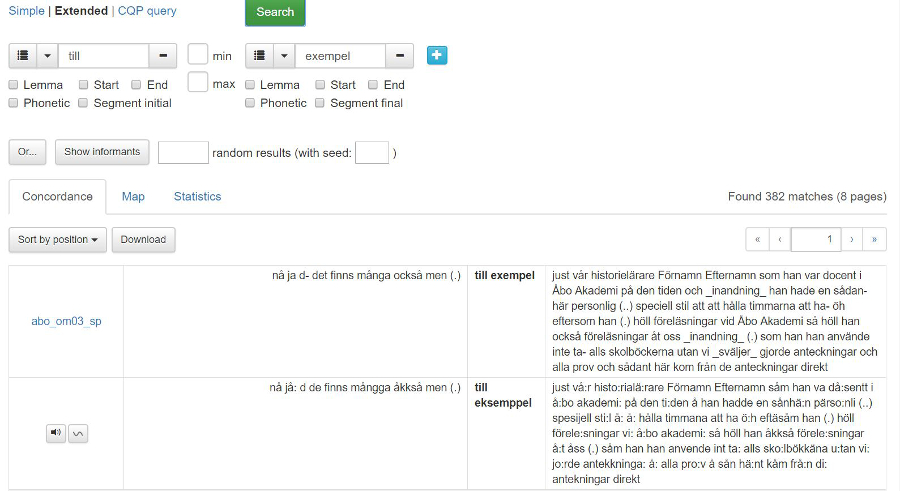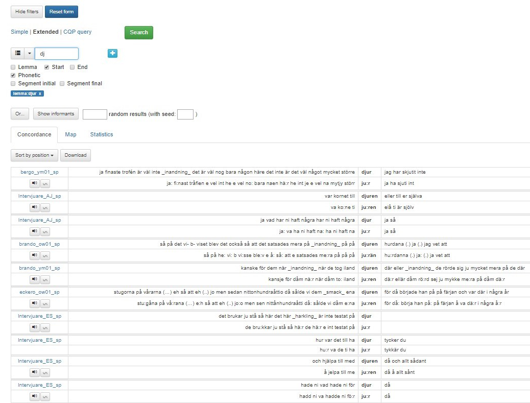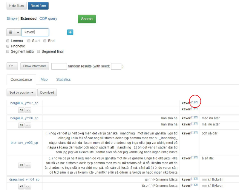 Förhandsvalet för sökresultatvisningen är konkordans (Concordance),men det är också möjligt att visa resultaten på en karta under fliken Map eller visa statistik i tabellform under fliken Statistics.