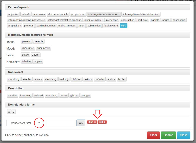 Om du väljer t.ex. verb i rutan med morfologisk information, men endast är ute efter hjälpverb, kan du specificera lemma och lägga till hjälpverben, ett i taget, i sökrutan till höger och klicka OK efter varje. Om du vill söka på verb, men inte få med träffar med hjälpverben, gör du på motsvarande sätt men väljer Exclude word form eller lemma.
