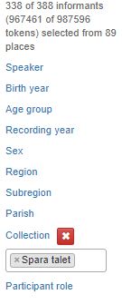 Varje informant har tilldelats en kod som består av ort och ålderskategori (younger/older), kön (man/woman) och materialsamling (sp: Spara talet/pn: Från Pyttis till Nedervetil). För att åtskilja personer från samma ort och samma informantkategori innehåller koden även ett nummer. Informantkoden esbo_ow01_sp visar alltså att talaren är en äldre kvinna från Esbo som intervjuats för Spara talet.