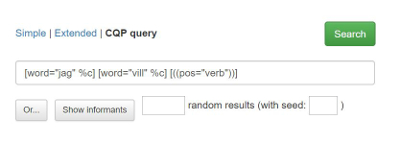 CQP-söksträngar kan användas till avancerade sökningar som inte är möjliga vid enkel och utökad sökning. För att använda dig av den här sökmöjligheten ska du behärska CQP-frågespråket. Bild 20 visar till exempel hur en sökning på orden jag vill efterföljt av verb ser ut i CQP query. För att se hur en avancerad sökning ser ut på CQP-frågespråket klickar du på CQP query för en sökning som du redan har fyllt i vid en avancerad sökning.