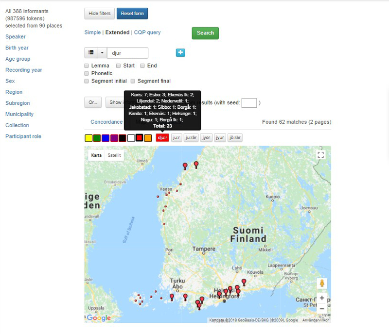 Under fliken Map redovisas sökresultaten på en karta. På bild 22 syns varje uttal för ordet ’djur’ som en egen knapp ovanför kartan. När man trycker på en av knapparna visas förekomsterna som färgade bollar på kartan. När man för kursorn över knappen visas antalet förekomster per ort. De uttal som inte är valda (dvs. djur med j-uttal) syns som små röda prickar på kartan.