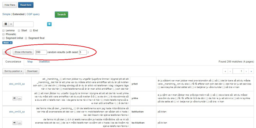 Om du vill återskapa exakt samma resultat senare, väljer du ett tal och lägger in i rutan with seed. I bild 24 visas en sökning på alla substantiv i korpusen och antalet 200 tillfälligt utvalda träffar. Talet 5 är inskrivet i with seed-rutan. Varje gång du gör samma sökning och skriver samma tal i rutan, får du samma tillfälliga urval av sökresultaten. Skriver du ett annat tal får du ett annat urval.