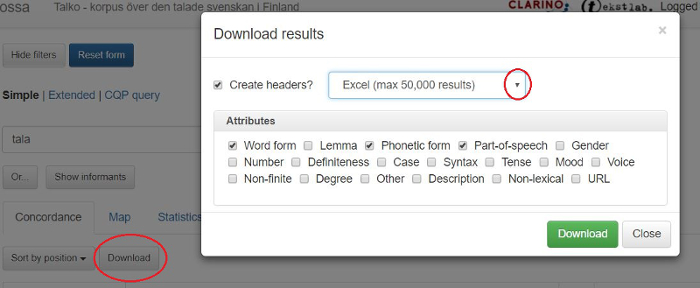Klickar du på knappen Download ovanför sökresultaten (se bild 26), får du upp en ruta där du kan välja bland olika alternativ på nedladdningsformat: excel-fil, tab-separerad textfil eller kommaseparerad textfil. Du kan också välja vilken information som ska laddas ned.