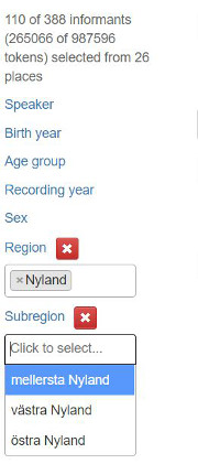 Kategorierna är hierarkiskt kopplade till varandra så att ditt val i en kategori påverkar de andra kategorierna. Om du t.ex. väljer Nyland i kategorin Region (se bild 3), kan du bara välja värden knutna till den regionen under Subregion, d.v.s. västra, mellersta och östra Nyland. Endast talarna från Nyland kommer att synas i kategorin Speaker.