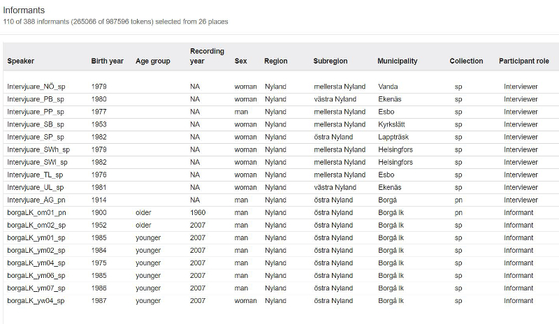 Om du önskar se en samlad översikt av de talare som du har valt, klickar du på knappen Show informants, se bild 4 för översikt över informanterna i Nyland.