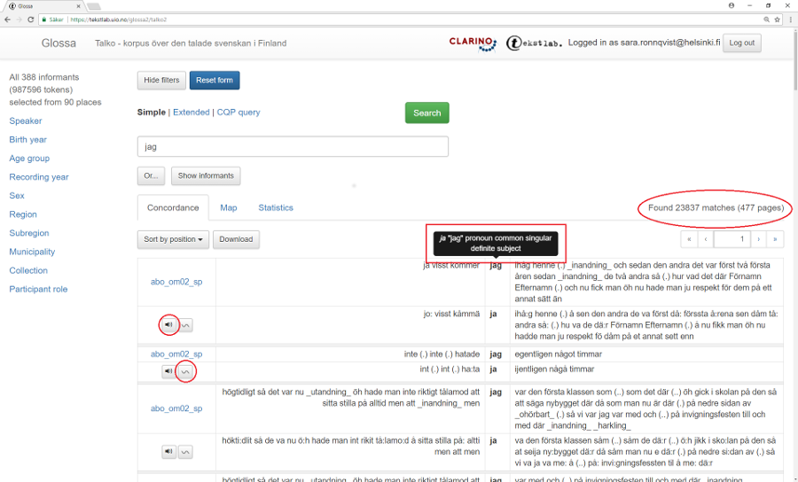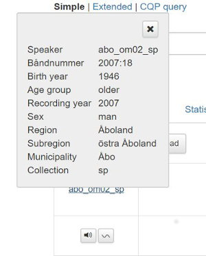 För du kursorn över ordet du har sökt på, får du upp en liten ruta i svart med information om ordklass och övrig morfologisk information (se bild 5). Klicka på informantkoden i kolumnen till vänster för att se metadata om talaren (se bild 6).