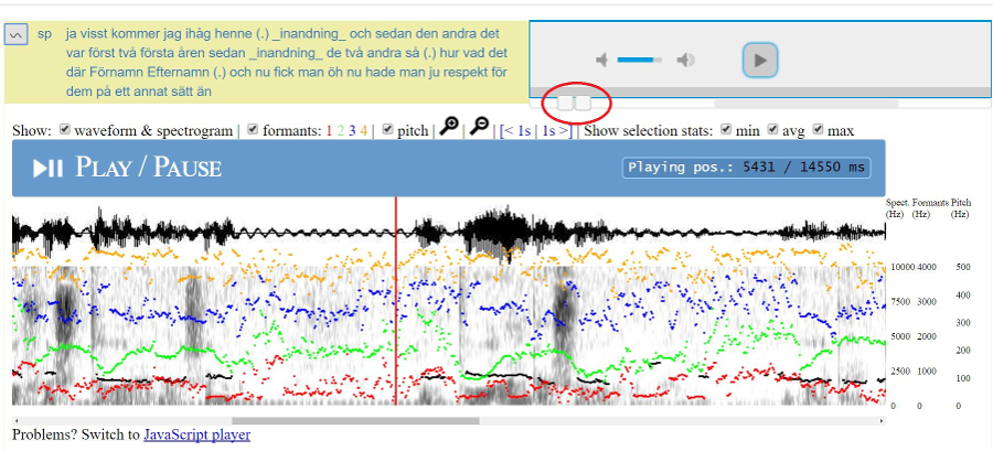 Under informantkoden till vänster finns två ikoner (se bild 5). Klicka på högtalarikonen för att spela upp ljudet för sökträffen. Klicka på ikonen bredvid för att se ljudvågor och ett spektrogram för sökträffen (se bild 7).