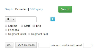 Det finns tre olika versioner av sökformuläret: enkel sökning (simple), utökad sökning (extended) och avancerad sökning med frågespråket CQP Query Language (CQP).