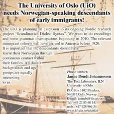 Alle informantene våre var eldre, den yngste var 67 og den eldste 90 år. De snakket alle norsk, og etter at vi tilpasset dialekten vår og tempoet, hadde vi få problemer med å kommunisere med dem. De hadde varierende norskbakgrunn; vi møtte etterkommere fra blant annet Jostedalen, Vestfold, Østfold og Mo i Rana, men de fleste var fra Hallingdalen, Telemark og Gudbrandsdalen. Selv om forfedrene deres hadde ulik dialektbakgrunn, snakket de fleste likevel en slags felles norsk-amerikansk dialekt som var mer som en generell østnorsk dialekt. De hadde alle også en del norsk-amerikanske dialektord, blant annet:
